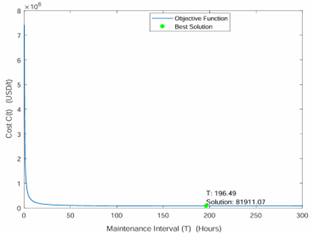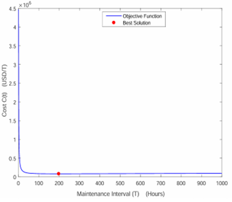 The fitness function for SA is the same as the cost function C(T) derived in the study Eq. (10). The goal is to minimize C(T) by finding the optimal maintenance interval T∗.