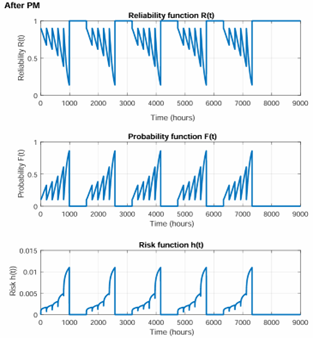 The hazard rate h(t) further underscores the effectiveness of the PM strategy, exhibiting a cyclical trend characterized by a gradual rise in failure risk during system operation and abrupt declines immediately after maintenance activities. The periodicity of these cycles, observed at intervals of approximately 1500-2000 hours, defines the maintenance schedule and indicates the strategic timing of interventions. Overall, this analysis demonstrates that the PM strategy effectively mitigates the instantaneous risk of failure, sustains system reliability, and addresses degradation mechanisms or replaces critical components before catastrophic failure occurs.