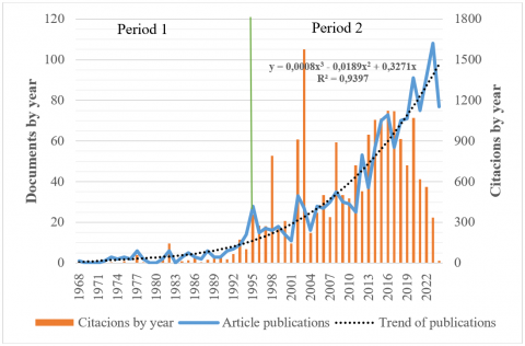 The scientific production on Occupational Safety and Health and falls from height consisted of 1,419 documents developed between 1968 and 2024 (Figure 4). The first contribution in this research field was made in 1968, with the topic “Cause of the accidents due to oxygen deficiency in underground works in Tokyo area” [39], which analyzes the oxygen deficiencies in underground constructions, the cause of accidents and how to avoid them. Within this research topic, there are two marked periods: period 1 (1968-1994) records very few publications, having a linear trend, while period 2 (1995-2024) presents an exponential trend (growing publications). In 1995, an increase in publications was observed due to the review of the sections of the OSHA standard on topics of interest, such as the control of exposure to lead, silica and asbestos [40, 41]; the improvement in the fall protection system (harnesses and anchors) in falls was also implemented [42]. Figure 4 shows that more research is being done each year on the topic (increasing trend), highlighting 2023, where the largest number of publications was recorded (108), and 2024, with a projection to increase this number of publications.