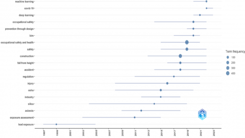 Figure 5 presents the research trends based on the authors’ keywords such as “lead exposure”, “quartz”, and “monitoring” that appear in the period from 1999 to 2007. The most cited topic within this period is “Clinical evaluation and management of construction workers exposed to lead” [56], which focuses on the effects of lead on human health, focusing on the diagnosis, treatment and prevention of diseases. Topics such as “silicosis”, “low back pain”, and “noise exposure” appeared in the period from 2008 to 2015, which are common diseases originating in civil works [57, 58]. The topics of “occupational health and safety” and “fall from height” are topics of high interest in the period 2016-2019 because they are more frequent in research, focusing on occupational risk management for the prevention of accidents, illnesses, and worker protection [22, 59, 60]. Finally, in the period 2020-2024, new topics such as “COVID-19”, “artificial intelligence” and “BIM” emerge. The authors Gan and Koh [61], in “Return to Work in the Construction Sector: Lessons from Singapore”, refer to the prevention of COVID-19 contamination in workers to resume construction activities in Singapore. Another research topic, “REDECA: a new framework to review artificial intelligence and its applications in occupational health and safety”, highlights the application of technology for worker health and safety [50, 62].