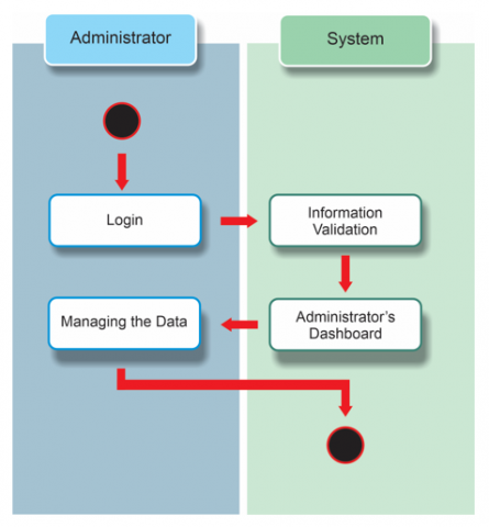 Activity diagrams are used in the SITUPANG system to illustrate the flow of activities performed by different user roles. These diagrams provide a visual representation of the logical sequence of operations and help identify interactions between users and the system components. Figure 4 shows the activity workflow for the administrator role.