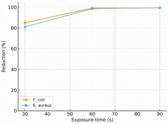 Bacterial inactivation was quantified as mean ± SD (n = 5). Results are summarized in Table 1, showing > 99% reduction after 60 s exposure.