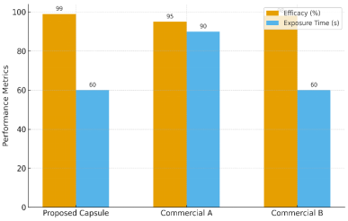 Results in Table 2 and Figure 12 show that the proposed capsule achieved similar or superior inactivation (> 99% at 60 s) while maintaining a ~40% lower fabrication cost (USD 120 vs. USD 200–250).