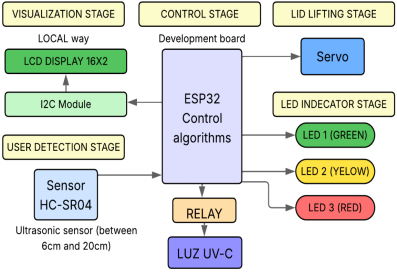 From an economic perspective, the system positions itself as a cost-effective alternative to commercial devices, offering advantages in portability and ease of deployment in hospitals, public transportation, and office settings. Furthermore, its ESP32-based architecture provides a foundation for future IoT integration, enabling remote monitoring and cycle traceability, as well as the incorporation of artificial intelligence to optimize exposure times and radiation doses for different surfaces and microbial strains.