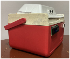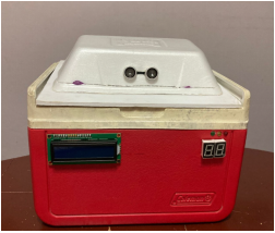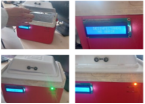 The UV-C disinfection capsule was designed as a portable, low-cost device for effective surface sterilization. The prototype integrates a germicidal low-pressure lamp (254 nm), a stainless-steel reflective inner lining to improve irradiance uniformity, and an ESP32-based control board for automated operation. Experimental validation focused on three aspects: (i) radiation safety, (ii) germicidal efficacy at different exposure times, and (iii) microbiological confirmation using agar cultures. Figure 5, Figure 6, Figure 7, and Figure 8 show the physical structure and user interface of the capsule. The front view (Figure 5) displays the LED status indicators and the LCD screen. The diagonal view (Figure 6) highlights the lid, hinges and outer housing. The internal irradiation chamber (Figure 7) presents the UV-C lamp, reflective lining and the sample holder designed for repeatable positioning. Figure 8 contains application and close-up images (lid operation, sample placement and LCD messages) illustrating typical use.