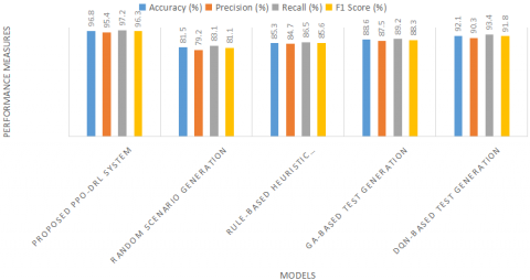 The proposed PPO-DRL-based test case generation framework demonstrates superior performance compared to four existing approaches shown in Figure 8. It achieves an accuracy of 96.8%, indicating strong classification between critical and non-critical scenarios. With a recall of 97.2%, it effectively detects most true critical cases, while its 95.4% precision confirms minimal false alarms. The F1-score of 96.3% highlights a balanced performance in both precision and recall. These results emphasize the effectiveness of integrating RL with PPO to generate diverse, realistic, and high-risk scenarios for AVs testing.