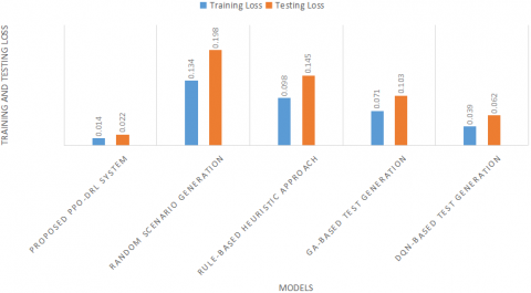 The proposed PPO-DRL architecture demonstrates excellent adaptability, achieving a maximum training accuracy of 98.1% and testing accuracy of 96.8% shown in Figure 9. This indicates strong generalization and effective learning of critical scenario features. In contrast, random scenario generation yields the lowest accuracy, reflecting poor learning capability. While rule-based and GA-based methods show moderate improvements, they exhibit noticeable gaps between training and testing performance. The DQN-based model performs better in consistency and precision but reaches only 92.1% testing accuracy. These results confirm the PPO framework’s effectiveness as a robust, intelligent approach for generating high-quality test scenarios in AV environments. The proposed PPO-DRL-based system achieves the lowest testing loss (0.022) and training loss (0.014), demonstrating superior adaptability and learning efficiency shown in Figure 10. These low values indicate consistent performance across unseen scenarios and effective modelling of complex relationships needed for generating critical test cases. While the DQN-based model performs better than random generation, it still incurs higher losses than PPO-DRL. Rule-based and GA-based methods show moderate results. Overall, the PPO-DRL framework proves effective in learning optimal test generation strategies while minimizing overfitting.