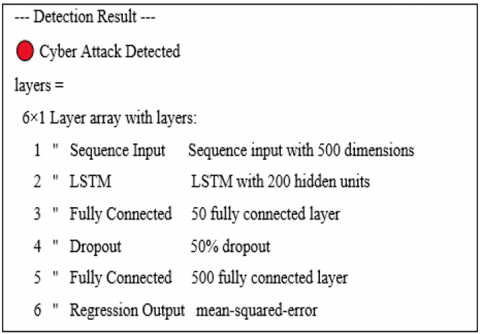 By referring to the above figure, the results of the program’s implementation of the proposed form can be observed, and able to determine that the wireless network has been subjected to a cyber-attack (Figure 15(a)). Also, "the same Figure 15(a) shows the details of the contents of the DL algorithm layers, which are 1) '' Sequence Input Sequence input with 500 dimensions, 2) '' LSTM with 200 hidden units, 3) 'Fully Connected 50 Fully Connected Layer, 4) '' Dropout 50% Dropout, 5) '' Fully Connected 500 Fully Connected Layer, and 6) '' Regression Output Mean-Squared-Error. Also, Figure 15(b) displays the same proposed DL algorithm structure in graph view.