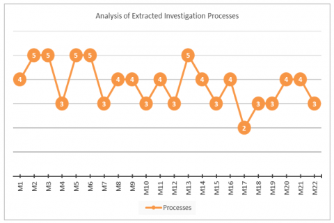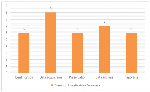 The investigative method was chosen as a typical investigation process because it occurs frequently in categorization. Five typical processes were identified in this study: Identification, Data acquisition, Preservation, Data analysis, and Reporting. They were selected from among 22 models identified in the literature (see Table 3).