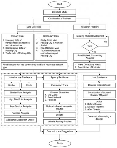Geologists state that Padang City is one of the cities that has a large potential for a tsunami and has a high risk because many residents are active in coastal areas [9]. Padang City is located on the island of Sumatra, where the subduction zone in the Sumatra region has produced tsunamigenic earthquakes, including the Mentawai tsunami in 2010, the Bengkulu tsunami in 2007, the Nias tsunami in 2005 and the Indian Ocean tsunami in 2004 [10]. The area close to Padang City has a subduction route that can trigger a strong earthquake and can even trigger a large tsunami because it faces the Indian Ocean, so this coastal city must be prepared to face the risks that may occur [11]. Therefore, according to the 2010-2030 Padang City spatial plan, it is necessary to plan a disaster evacuation network system in the form of evacuation routes and evacuation sites on a city, regional and environmental scale. In its implementation, it is necessary to carry out special studies related to the planning of disaster evacuation network systems, including those carried out through studies with the concept of resilience, which focuses on the scope of transportation. The determination of the study includes the level of accessibility of evacuation routes, logistics distribution channels, and determining the location of shelters appropriately to assist the community and government in evacuating due to the tsunami disaster through effective disaster mitigation. The selection of the evacuation route is closely related to the relative spatial syntax steps, which show that the majority prefer to walk in a straight line to reach the assembly point [12]. Logistics distribution acts as a link that connects producers and consumers, who have an important role in the supply chain ecosystem [13]. Shelter locations are often difficult to access, and access is even cut off during the impact of the disaster on the route being traversed [14]. Disaster mitigation needs to actively involve community participation and encourage understanding regarding disaster risk management [15].