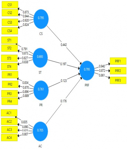 Then, two criteria were used to assess the model fitness coefficient determination R2 and predictive relevance Q2. The R2 is 0.713, which means independent variables explain 71% of passenger preferences. The studies [42, 45] recommended that the explanatory power in R2 above 0.70 is acceptable for the research. Next, the value of Q2 greater than zero indicates that the path model can predict the observed initial value. The Q2 value is 0.556, which means customer service, safety, accessibility, and price have significant predictive relevance to passenger preferences.