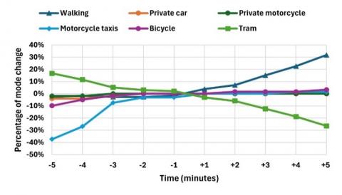 Illustration of mode choice elasticity presents in Figure 3. These findings advocate for strategic transportation policies prioritizing tram reliability, with potential integration of real-time service updates and optimized scheduling to mitigate waiting periods. Furthermore, the elasticity of active travel modes suggests that incremental service delays could unintentionally encourage greener travel practices. Policymakers can leverage this dynamic to foster a balanced modal distribution, reducing the environmental footprint and enhancing campus accessibility. Overall, the nuanced understanding derived from elasticity metrics provides a robust foundation for informed decision-making in campus transportation planning.
