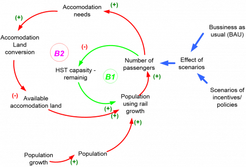 Dynamic system analysis aims to provide a comprehensive understanding of the effect of HST on passenger volumes over time, with detailed insights into land use changes related to accommodations and resource allocation. This analysis seeks to develop recommendations for maximizing the benefits of HST development through the integration of land use and transportation planning, supported by forecasts and scenario analyses to assist urban planning and policymaking. Additionally, the conceptual causal cycle of system dynamics model, which centres on HST transportation between Jakarta and Bandung, shows substantial impacts on hotel occupancy rates in Bandung. Several key objectives are outlined for using dynamic system method, including: (a) simulating the volume of Jakarta-Bandung HST passengers generated from demographic trends, (b) executing diverse scenarios to enhance the number of Jakarta-Bandung HST passengers, (c) modelling the residual carrying capacity of the Jakarta-Bandung HST system, and (d) simulating the remaining land capacity designated for accommodation purposes. This dynamic interaction is visualized in the Causal Loop Diagram (CLD). Figure 2 shows the limitation posed by Jakarta-Bandung HST capacity (Loop B1) and the constraint from limited land availability for accommodations (Loop B2).