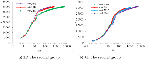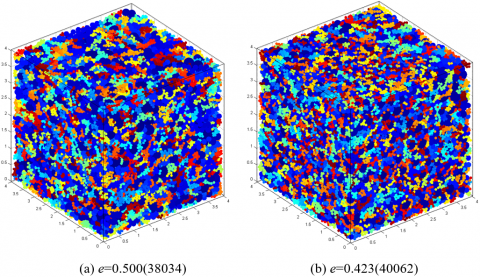 To compare the relationship between the number of particles generated and the time, choose the same particle size distribution (Table 1 and Table 2) to generate the accumulation body according to the specified pore ratio, and test the relationship between the number of particles generated and the time. As can be seen from Figure 13, 2D and 3D showed a good linear relationship, 2D generated 560000 particles took nearly 1.8h, 3D generated 760000 particles took nearly 2.1h, it is ideal in the generation speed. Meanwhile, the results in Figure 13 shows that, under some conditions, the rate of 3D generation is slightly faster than that of 2D generation, which is mainly due to the fact that there is an extra degree of freedom in space in the generation process of 3D space, which leads to a higher probability of successful particle generation in space, resulting in a shorter time.