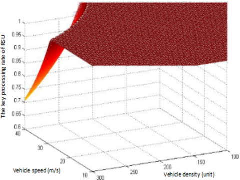 Figure 3 shows the key processing rate $S _ { \text {ratio of the RSU } }$ with the changes of $v$ and $d ,$ where $100 \leq d \leq 300$ and $10 \leq v \leq 40$. It is easy to infer that the RSU effectively handled the key requests in most cases, for the Sratio=1. With the growth in v and d, the Sratio gradually declined, and the decrease was over 70% at the most. Hence, the CPP is both feasible and effective.