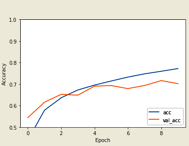 In this dataset use the sequential model total number of parameters 56,320 and trainable parameters are 56,320 then to complete the model add the dense layers on top, feed the model tensor last output from the convolution base with shape (3, 3, 64) to do classification, Dense layers take 1D vectors as input while the 3D tensor its present output. First, flatten the 3D output into 1D then add another one denser layer on the top, CIFAR has ten output classes so use the 10 outputs for final dense layers, and SOFTMAX is activation function, a sequential model used for a model summary, in this the total number of trainable parameters is 1, 22,570. To train and compile the model use the ADAM optimizer, sparse categorical cross-entropy used for the loss function, accuracy is measured in metrics, epochs = 10, we get the accuracy is 77% and validation accuracy is 70%, Evaluate the model we get the test accuracy is 70% (Figure 12).