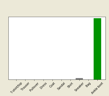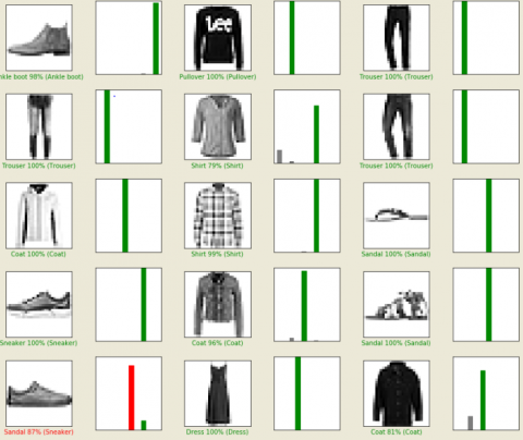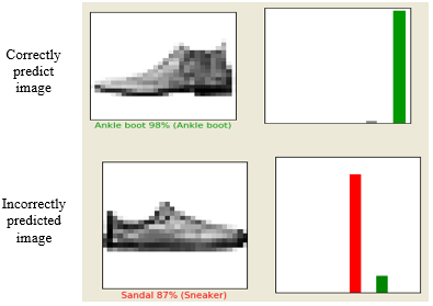 To measures the accuracy of the model during the training use the loss functions, optimizer defines the update the model based on the data, metrics are used to monitor the training and test data that are to be correctly classified. After compile the model we have to train the model it contains the steps, feed to train the model after that model learns the associate images and labels, and model can predict the test data for these use model. fit, after 10 epochs get the 91% accuracy, Next step is to evaluate the accuracy-test data compare how model performs, it returns the accuracy is 88% for test data. The result will be slightly less when to compare the training set accuracy .so the difference between the training and test accuracy leads to model over- fitting because of hat model performs worse to train new input data. After that we have to make the prediction about the images, for this prediction label for each image in testing data prediction of a group of ten numbers represent the model confidence images of ten different articles of clothing, the Correct prediction label represents green and incorrect label represents red color for the predicted label. Performance evaluation on sample image is given on Figure 6.