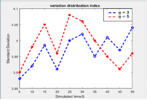 Figure 3 shows a variation of the standard deviation λ of the packet length at different variation distribution indices φ. It can be seen that the beginning of the simulation show difference in distribution index. The smaller φ leads that the curve is smaller of standard deviation, and the larger variation distribution index φ have small value of the standard deviation for the curve. Because there are few data packets gathered at node_D in the previous period, the number of whale agents with a standard deviation λ smaller than the threshold λmax is smaller.