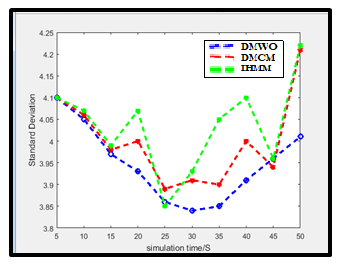It is clear from Figure 4 that after the experiment enters the stationary process (after 15s of simulation time), the standard deviation of the curve corresponding to DMWO is smaller than the other two algorithms. And from the perspective of the classical deviation jitter, DMWO also tends to be stable, whereas the IHMM corresponding curve has higher jitter.