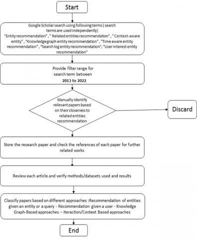 Although there has been a lot of work done in the fields of recommender systems, web search, and information retrieval, entity recommendation and search techniques are distinct from these fields. In order to establish this new trend of recommending related entities to users’ queries, numerous works and studies have been conducted. We followed PRISMA guidelines when conducting the review [6]. We searched papers related to searches and entities recommendations and related entities recommendation using Google Scholar (Springer link library, ACM library, Science Direct library, IEEE library, etc.) starting in 2013 (emergence of the first recommendation system of related entities to queries [7]). Additionally, we looked for publications that used knowledge graphs, user interactions and the context of user to recommend entities. Although there isn't much research on recommending related entities, we did notice that knowledge-based recommendation is widely used in general. The PRISMA flowchart is used in Figure 1 to depict the entire paper selection process [6]. As shown in Figure 1, Search terms “Entity recommendation”, “Related entities recommendation”, “Context-aware entity”, “Knowledge graph entity recommendation”, “Time aware entity recommendation,” “Search log entity recommendation”, “User interest entity recommendation” were used. We also kept the search results limited to papers after 2013. From the resulting articles, we categorized them to papers that recommend entities given an entity and papers that recommend entities given a query and papers that recommend entities given a user [8] as shown in Figure 2.