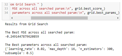 The results of the experiment used the parameters in Table 1. The best parameters are n_estimators: 50, max_depth: 12, subsample: 0.5, and learning_rate: 0.1, with the best MSE value of -0.249. The code snippets and results are shown in Figure 2.