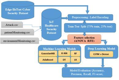 Initially, the dataset is acquired and preprocessed in order to get all columns in a numerical form. For the first dataset, three separate files are concatenated together to constitute the overall dataset. (The attack file, the patient monitoring information file, and the environment monitoring information file). For the next step, the label encoding algorithm is used. This step is essential to guarantee that all columns have numerical values so that they can be used in the training process.