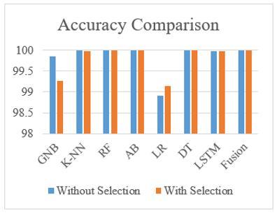 Table 1 shows that K-NN, RF, DT, and AdaBoost algorithms achieve an accuracy of 100% besides all other performance metrics which are all 100%. The Next best model is the LSTM model with a 99.94% score on all metrics. However, among the best-registered results, DT has the least computational time.