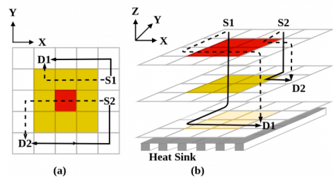 There are substantial thermal problems with 3D NoCs due to the high power density and restricted heat dissipation capabilities. Packets are directed by the routing algorithm to routers with better cooling or less traffic. It accomplishes this by employing techniques that evenly distribute generated heat across the chip area, utilizing both horizontal and vertical traffic distribution methods [22].