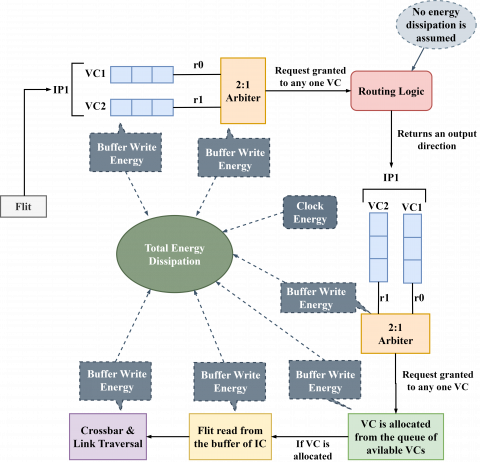 (1) The journey of a flit in the simulator begins with its entry in the input channel of a tile. Every flit has a VCid associated with it and is stored at the end of the First in First Out (FIFO) buffer of that VC (adaptive routing). At this point, the energy associated with buffer write is consumed. To keep track of this, the number of buffer writes is increased by one whenever a flit is stored in the FIFO.