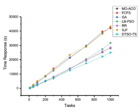 The DTSO-TS algorithm consistently had the lowest response time among the algorithms tested, with values ranging from 140.11 seconds for tasks of 10 to 5181.86 seconds for tasks of 200. Hence, this suggests that the DTSO-TS algorithm is able to carry out tasks in a shorter time than other algorithms. The highest response times were for tasks of 10, from the FCFS, GA [18] and SJF algorithms, being respectively 419.50 seconds for tasks of 10 to 8626.72 seconds for tasks of 200. This implies that these algorithims move rather slowly, perhaps because of how they order and assign tasks.
