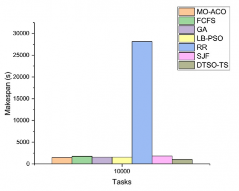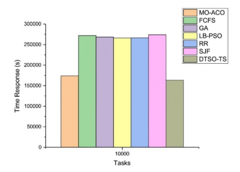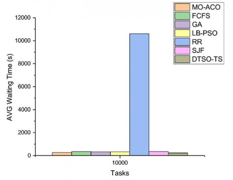 Figures 5-8 present the results of simulations showing how well the DTSO-TS algorithm performed for tasks of 10000 with regard to response time, Makespan and AVG waiting times as well as throughput value for all tested algorithms; its values being among the lowest of any algorithm tested; additionally, it had the highest throughput value among them all. Other algorithms like MO-ACO [16], GA [18], and LB-PSO [17] also achieved low values but lower throughput values compared with that of DTSO-TS while the FCFS, RR, and SJF algorithms had relatively high values for response time, Makespan, and AVG waiting time and lower throughput values compared to the DTSO-TS algorithm.