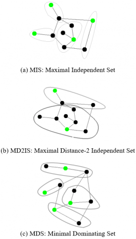 Figure 1 serves as an illustrative guide for conceptualizing the Maximal Independent Set, Maximal Distance-2 Independent Set, and Minimal Dominating Set. In this figure, nodes delineated in green represent members of the respective set. It is noteworthy that, as depicted in Figure 1(a), the MIS showcases a pairwise node distance of at least two edges. In contrast, Figure 1(b) reveals that within the MD2IS, the inter-node distance is strictly greater than two edges. In the case of MDS, any node not inside the MDS (represented with black) is at least adjacent to one member of the MDS, thereby satisfying the domination property.