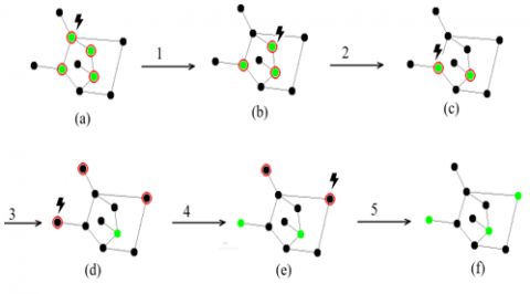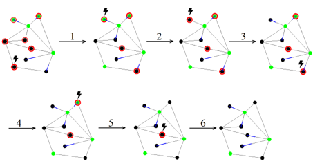 Figure 2 illustrates how algorithm MD2IS reaches the legitimate configuration after it starts from a random initial configuration. Black nodes are outside S while green nodes denoted elements inside S. If nodes are surrounded with red circles, the system is in an illegitimate configuration. Nodes surrounded in red color represent privileged nodes that are capable of executing a move. Using a central daemon, at each step, the daemon selects only one privileged node to carry out a move. The MD2IS set is achieved after five moves according to the sequence of rules: R2, R2, R2, R1, R1. Once no node (surrounded with red color) exists, the graph is considered in the final legitimate configuration. Note that, certain moves, such as the transition from configuration c to configuration d, may activate additional nodes in subsequent configurations.