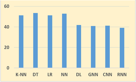 In Model Generation and Evaluation, five machine learning techniques were employed which were:-Decision Tree (DT), k-Nearest Neighbors (k-NN), Linear Regression (LR),Feed Forward technique (Deep Learning (DL)) and Neural Network(NN). Three more deep learning models were introduced to make it an Eight-fold cross-validation model, the dataset was divided into eight equal-sized subsets or folds. The model underwent training on seven folds and was assessed on the eighth fold. The training was repeated eight times to ensure each fold served as the evaluation set once. The outcomes from each iteration were averaged to derive an overall performance measure for the model thus, the data was meticulously compiled into a table in Table 1, culminating in the creation of a comprehensive graph in Figure 4.
