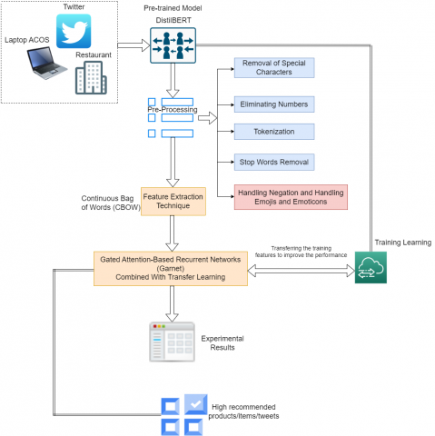 (1) An advanced sentiment analysis is implemented with the GARNET model combined with the transfer learning that gets the significant patterns from the DistilBERT which is a pre-trained model.