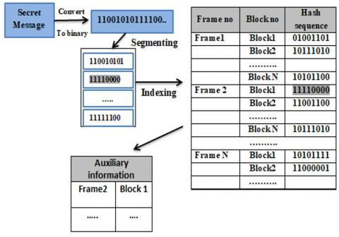 To simplify the transfer of the confidential data, the transmitter first converts the confidential data to a bitstream and then splits it into segments of the same length, typically 8-bit. It should be noted that if the length of the bitstream is not a multiple of 8 bits, numerous zeros are appended to the end. Then, using every segment as a separate query, all blocks of the video whose hash sequences match the segment are collected and indexed as auxiliary information as shown in Figure 3.