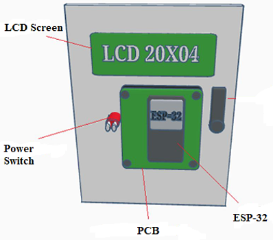 Equally important, other essential components include a 20 × 4 cm LCD screen, a power switch, an ESP-32 microcontroller, and a perforated PCB for mounting and wiring, all of which are placed on the back of the panel box door, as shown in Figure 2(a). This arrangement allows for easy access and monitoring of the system’s status and functions. In Figure 2(b), several vital components are also depicted, including a 12V 20A Power Supply Unit (PSU), a relay pinout used for temperature control, a 4-channel relay module, and a pump module. These components work together to ensure seamless operation of the automated watering and monitoring system, providing efficient power distribution and control for managing irrigation and plant growth.