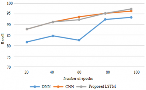 In case of calculating recall, it is essential to consider the proportion of the genuine Positive samples among the total number of Positive specimens. Recall is the measure of the ability of a model in identifying positive samples as explained in the following section. The list of representatives that will be tested will simply increase and, in the process, more positive samples will be observed. The recall comparison between the proposed LSTM model and the already discovered CNN and DNN models and was achieved using the TCGA dataset in Figure 8. While the epoch numbers occupy the x-axis, recall value occupies y-axis of the graph plotted below. While assessing the model, employ a total of, 100 generations. The following suggested method provides a recall of 2% to 5% while dealing with genetic data and the existing models do not have a better recall.