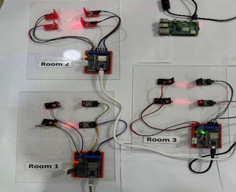 As mentioned before, local units consist of sensors and actuators attached to ESP32 microcontroller. Every ESP32 is linked to three sensors: light sensors (LDR), infrared (IR) sensors for occupancy detection, and temperature and humidity sensors (DHT22). Real-time environmental data collected by these sensors is localized by the ESP32 and then sent to the Raspberry Pi via MQTT. The ESP32 units also follow Raspberry Pi control commands, which they utilize to run actuators such as LEDs that symbolize three modes of operations.