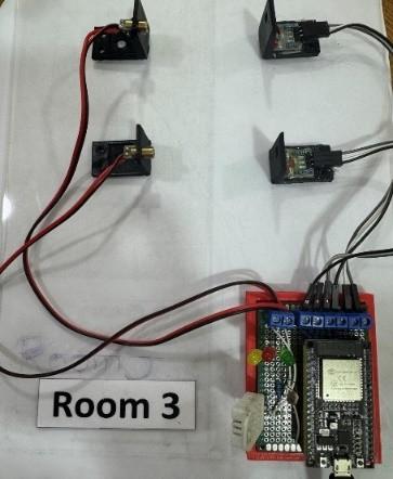 Using a mix of hardware, cloud monitoring, and centralized control, three LUs are used concurrently in this case study to monitor and control various rooms within a building. LU1 represents room 1 which is in Shutdown mode LU2 signifies room 2 in Select mode and LU3 denotes room3 in Full mode as shown in Figure 15 which depicts the hardware configuration for the three rooms, thereby highlighting how each room has sensors and controllers linked to an ESP32 microcontroller (LUs), which is in charge of interacting with the CU (Raspberry Pi), it could be seen that each LU operates in different modes as implied by the various LEDs.