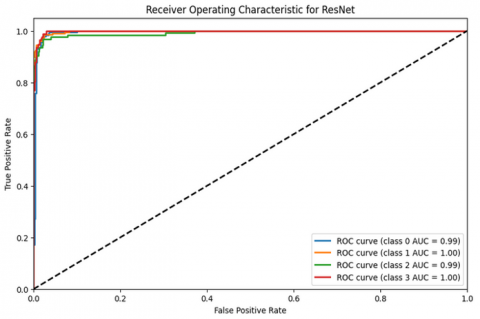 In contrast, the ROC curve for DenseNet+LightGBM in Figure 3 demonstrates stronger performance, as it achieves higher sensitivity while maintaining a low false positive rate, with the curve closer to the top-left corner. Additionally, VGG16+LightGBM in Figure 4 shows near-perfect discrimination.