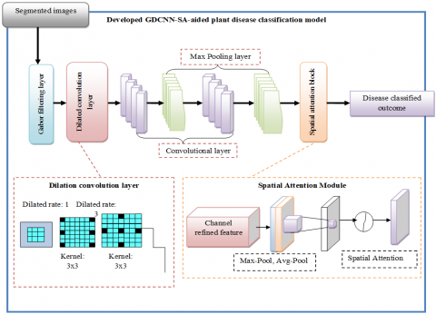 Deep learning, a variant of artificial intelligence is extensively employed in image processing, because of its efficiency in analyzing huge volumes of input information, which is essential for disease classification. Thus, a novel plant disease classification system is designed by exploiting the advantages of deep learning. Here, the plant leaf images accumulated from the internet resources are employed throughout the training and testing phase. At the beginning stage, the collected images are offered to the designed Trans-R2UNet model. The Trans-R2UNet is constructed by incorporating the functions of the transformer with the R2UNet to determine the disease-affected region on the plant leaf, which is essential for accurate classification. Later, the segmented images are provided to the introduced GDCNN-SA to classify plant diseases. The GDCNN-SA is built by establishing a dilated and spatial attention connection to the GCNN model. Additionally, the capability of the suggested classification model is investigated by analyzing the resultant values with the standard classification networks. The pictorial view of the designed plant disease classification system is represented in Figure 1.