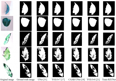 An optimized watermelon scion leaf segmentation framework was proposed, combining the Hungarian algorithm with information theory to select optimal features through a re-ranking scheme [23]. An improved Mask2Former network efficiently segmented the watermelon scion leaf with high accuracy. This approach had recall of 99.21%. But this framework was inadequate to adapt to the real-time segmentation in dynamic field conditions.