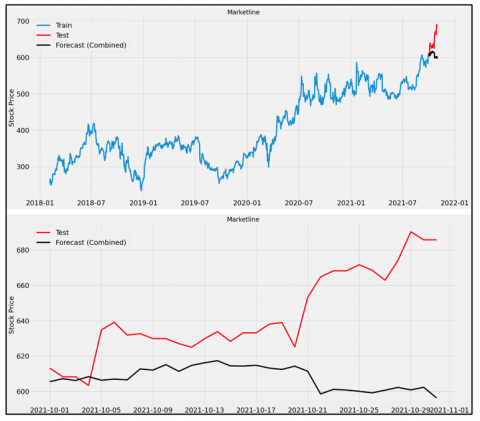 For the hybrid model with weights of 0.6 for SARIMA and 0.4 for XGBoost, we obtain the RMSE=45.35 With an average stock price of 643.11, the error percentage relative to this average is 7.05%
