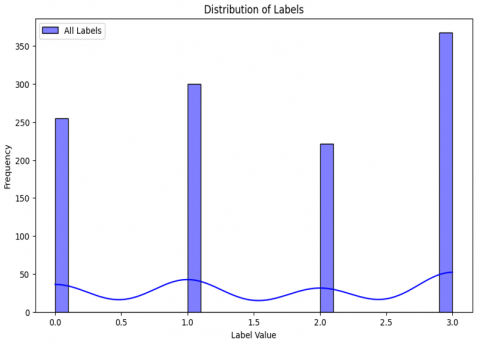 Figure 2 shows the dataset's class distribution. The x-axis shows several class labels ranging from -0.5 to 3.5; the y-axis shows the count of instances for every class. Class 3 stands out as having the most frequency-more than 350 cases-which suggests a possible dataset imbalance.