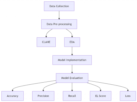 1. Import Required Libraries Import necessary libraries: - TensorFlow/Keras for deep learning - NumPy for numerical operations - OpenCV for image processing - Matplotlib for visualization (optional) 2. Data Preparation Load dataset: - Load images and labels for nitrogen-deficient, leaf rust-affected, and healthy leaves - Split dataset into training, validation, and test sets (70:15:15) 3. Image Preprocessing Function preprocess_images(images): For each image in images: - Apply Otsu-based masking to isolate leaf areas - Resize image to (135, 270) pixels - Apply contrast stretching - Apply CLAHE with tile grid size (8, 8) and clip limit of 2.0 Return preprocessed images 4. Data Augmentation Define ImageDataGenerator: - Set parameters for augmentation (rotation, width shift, height shift, horizontal flip) 5. Define Model Architecture Function build_classification_model(input_shape, num_classes): Create input layer Add depthwise separable convolution block Add max pooling layer Add residual block Add squeeze-and-excite block Add convolution and pooling layers as needed Add self-attention block Flatten output Add fully connected layer with ReLU activation Add output layer with softmax activation for multi-class classification Return model 6. Compile Model Set model parameters: - optimizer: Adam - loss function: categorical cross-entropy - metrics: accuracy Compile the model 7. Train Model Fit model on training data: - Use preprocessed images and labels - Set validation data for performance monitoring - Define number of epochs and batch size 8. Evaluate Model Evaluate model on test set: - Calculate accuracy and loss - Optionally visualize results (confusion matrix, ROC curve) 9. Save Model Save the trained model for future use 10. Predict on New Data Function predict(image): - Preprocess the image - Use the trained model to predict class - Return predicted class label |