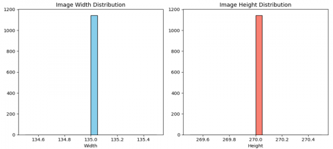 In Figure 4, two distribution graphs showing the image dimensions in the dataset help to depict this. Centred on 135 pixels, the left plot displays the width distribution with a homogeneous count of roughly 1,200 photos at this width. With about 1,200 photos, the correct plot shows the height distribution-mostly around 270 pixels. Essential for homogeneity in image processing and analysis, these visualisations show a constant size over the dataset.