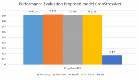 Table 2 presents the performance assessment of the proposed model, CropStressNet, stressing its capacity in precisely forecasting crop stress. With an accuracy of 0.9214, the model shows good performance by accurately categorising over 92% of the cases. With a precision score of 0.9250, CropStressNet forecasts crop stress with dependability, hence reducing false positives. With a recall score of 0.9214, the crop stress may be precisely identified, so guaranteeing few false negatives. With an F1-score of 0.9215, accuracy and recall are balanced, so indicating general strength. Furthermore, the minimal loss of 0.17 points to a well-trained model producing consistent forecasts. Performance graph in Figure 5 shows evaluation of proposed model.