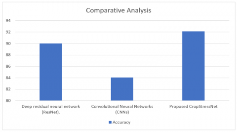 Table 3 offers a comparison of the suggested CropStressNet model with current models, namely with reference to Deep Residual Neural Network (ResNet) and Convolutional Neural Networks (CNN). CropStressNet's performance is assessed using accuracy, therefore indicating a notable improvement in predicting powers in the field of crop stress evaluation. With an accuracy of 90%, the Deep Residual Neural Network (ResNet) proves to be really useful in many different fields. With an amazing accuracy of 92.14%, the suggested CropStressNet does, however, surpass this approach. This development shows a clear increase in the model's capacity to accurately identify cases of crop stress, hence increasing its dependability for agricultural surveillance. By comparison, the conventional CNNs have a less accuracy of 84.1%. This disparity highlights the need of more specialised architectures like CropStressNet by stressing the limits of CNNs in managing the complexity related with crop stress detection. The higher accuracy of the suggested model suggests that, probably because of its architectural innovations and training approaches, it is more suited to capture complex patterns in the data. Overall, the improved performance of CropStressNet shows a significant contribution to the field and promises better decision-making possibilities for farmers and agricultural stakeholders in properly managing crop health.