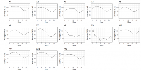 Although, in general, the air quality index has a similar pattern every day, there are differences in the pattern in several conditions, such as on Christmas Day (X8) and New Year (X9). On Christmas and New Year’s Day, the air quality index decreases from the beginning of the day until 05.00 and tends to be stationary after that. Apart from that, even though the air quality index has the same pattern in other conditions, there are differences in the range of air quality index values where conditions such as holidays (X2), collective leave (X3) and CARE (X13) have a lower range of air quality index values. This indicates that there are anomalies in these conditions.